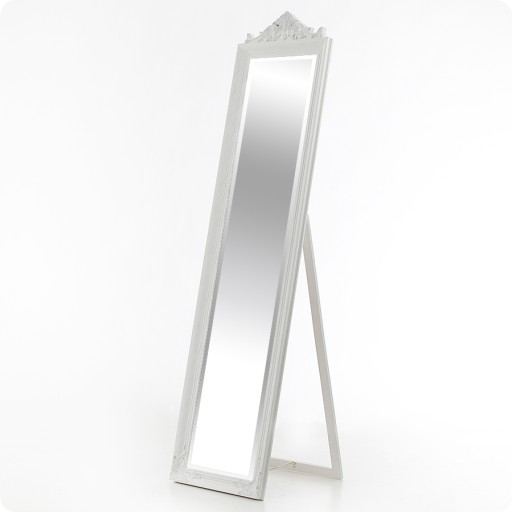 Nasze wysokie, stojące lustro składa się z fazowanej tafli oraz ramy wykonanej z połączenia drewna i polyresingu. Obramowanie posiada białą barwę, której nadano miejscowe przetarcia w celu wystylizowania go na stare. Dodatkowo prezentuje się ono w bardzo ciekawej, antycznej linii dekoracyjnej. Jest to świetna pozycja do łazienki, czy też korytarza lub salonu, jednak z doświadczenia wiemy, że klienci lubują się w korzystaniu z własnych pomysłów na jego zastosowanie.