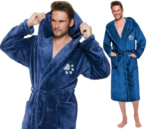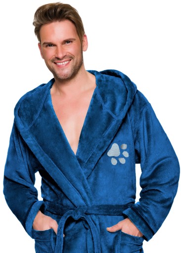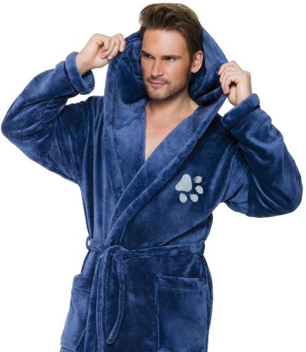 Szlafrok męski z kapturem, wiązany w pasie, z miękkiej dzianiny (soft), na biodrach kieszenie zewnętrzne, na wysokości klatki piersiowej haft - psiał łapka.
