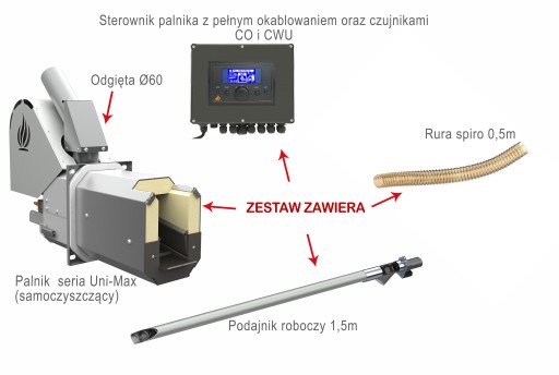 Palnik na pellet Eco-Palnik Uni-Max 20kW Samoczyszczący + sterownik palnika + rura spiro + odgięta Ø60 + podajnik roboczy 1,5m