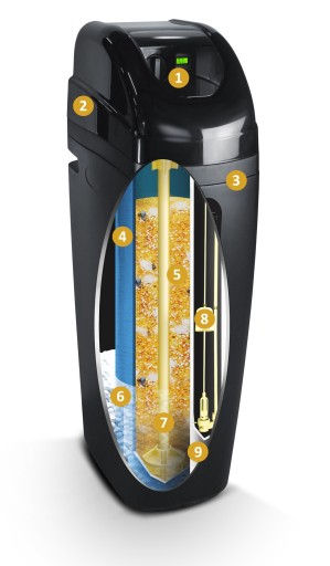 8. Zawór solankowy sterujący przepływem wody do i ze zbiornika solanki, wyposażony w zabezpieczenia antyprzelewowe.