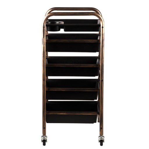 Pomocnik fryzjerski dwustronny w kolorze starego złota, posiada 4 kuwety i uchwyty na asortyment fryzjerski.
