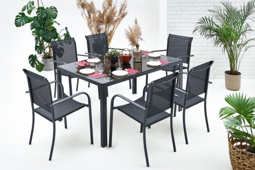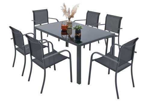 ZESTAW MEBLI OGRODOWYCH idealny do Twojego ogrodu. Stelaż został podwójnie lakierowany proszkowo, co idealnie przystosowuje ten produkt to zastosowania wewnątrz jak i na zewnątrz. Siedzisko krzesła oraz oparcie zostało zrobione z szarego, elastycznego obicia tekstylnego tak, aby maksymalnie zwiększyć wygodę. Posiada ono dwa oparcia boczne. Użyte materiały nie wymagają częstej konserwacji, są odporne na warunki pogodowe i nie wymagają specjalnych środków do pielęgnacji. Nóżki są dodatkowo zaopatrzone w nakładki z tworzywa sztucznego. Stół posiada szary kolor szyby o gr. 5 mm.