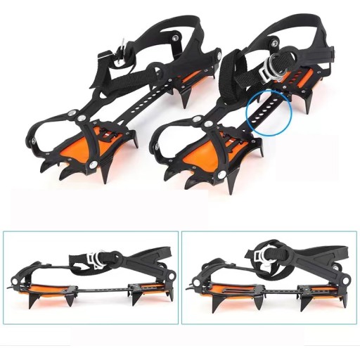 - Wytrzymała stal manganowa, z próżniową obróbką cieplną i procesem odpuszczania, charakteryzuje się dużą twardością i wytrzymałością, co zwiększa przyczepność podczas chodzenia i wspinania się po śniegu, aby zmniejszyć ryzyko upadku.