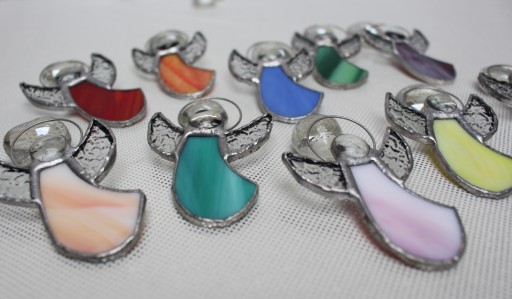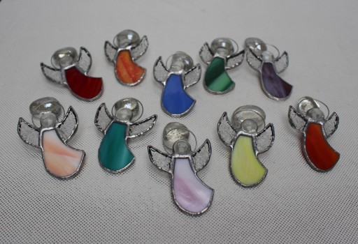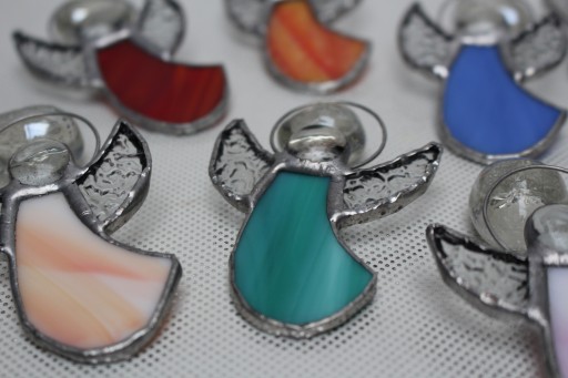 Sukienki aniołków wykonane są z tzw zamkniętego szkła witrażowego. Oznacza to że ich barwione w masie kolory przepuszczają światło, ale nie kształty, w związku z tym można je powiesić nie tylko na oknie ale i na ścianie.