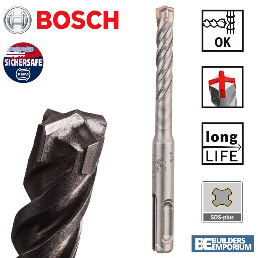 - Znak niemieckiej jakości SICHERSAFE wierteł do muru – wiertła posiadają specjalny znak jakości mówiący o idealnym osadzeniu kotew i dybli w otworach wywierconych wiertłami SDS-Plus plus-5X firmy BOSCH