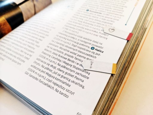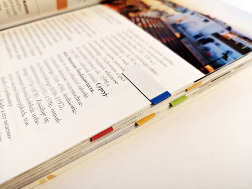 Krawędzie zakładek są w 4 kolorach, dzięki czemu po zamknięciu książki są wyraźnie widoczne. Każdym kolorem, można też zaznaczać różne kategorie fragmentów.