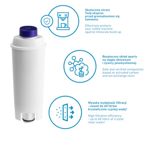Wysokiej jakości zamiennik filtra do ekspresów Delonghi. Oczyszcza wodę z drobin mechanicznych, metali ciężkich, pestycydów, wapnia. Dzięki specjalnej formule wkładu 20% lepsza** filtracja wody przeciwdziałająca osadzaniu kamienia w ekspresie. Odczuwalnie poprawia smak i zapach wody, co ma bardzo duże znaczenie przy zaparzaniu kawy.