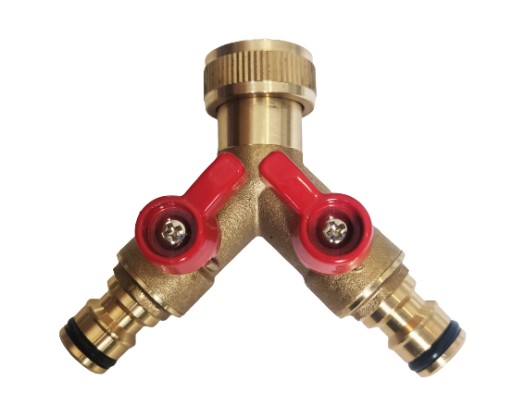 MOSIĘŻNE DWU DROŻNE PRZYŁĄCZE NA KRAN Z GWINTEM WEWNĘTRZNYM 3/4" Z ZAWORAMI I SZYBKOZŁĄCZKAMI.