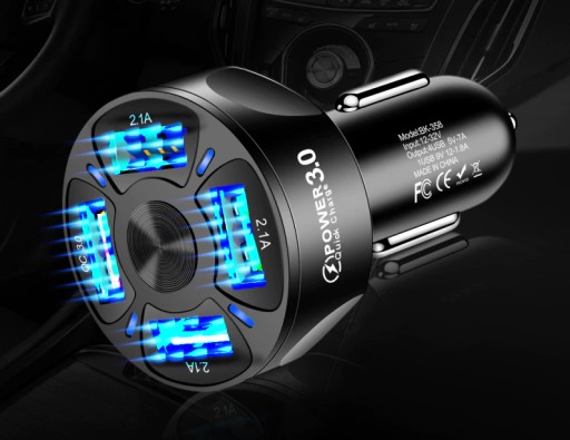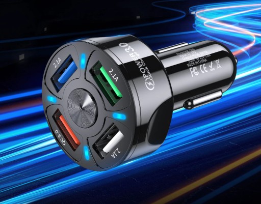 Samochodowa ładowarka z czterema portami USB i podświetleniem LED. Jeden port z funkcją szybkiego ładowania QC3.0 a pozostałe trzy o napięciu 2,1A. Zestaw umożliwia jednoczesne korzystanie ze wszystkich gniazd, czyli ładowanie np. nawigacji i telefonu w tym samym czasie.