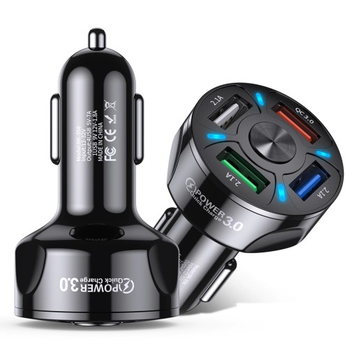 Samochodowa ładowarka z czterema portami USB i podświetleniem LED. Jeden port z funkcją szybkiego ładowania QC3.0 a pozostałe trzy o napięciu 2,1A. Zestaw umożliwia jednoczesne korzystanie ze wszystkich gniazd, czyli ładowanie np. nawigacji i telefonu w tym samym czasie.