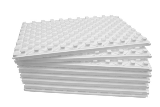 • Płyty można układać jedna obok drugiej, ewentualnie docinając je na wymiar tam, gdzie jest to konieczne. Na spodzie każdej płyty wytłoczono wzór „szachownicy”, co znacznie ułatwia ich obróbkę.