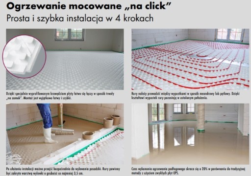 • Ograniczenie liczby elementów systemu poprzez rezygnację z klipsów, foli termicznych, duże rozmiary płyt oraz zmniejszenie zużycia wylewki dzięki gęsto rozmieszczonym wypustkom sprawiają, że czas wykonania 1m2 podłogi jest krótszy o prawie 20% w porównaniu z metodą tradycyjną, a zużycie wylewki zmniejsza się o 25% w porównaniu z wylewką na płycie EPS z folią metalizowaną