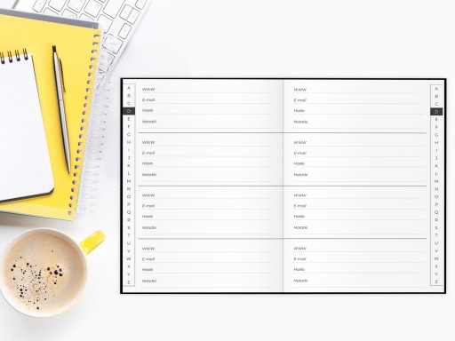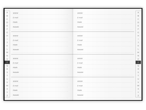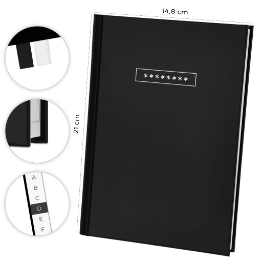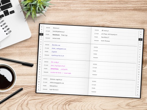 Pomieści ponad 600 haseł oraz danych logowania. Wyszukiwanie strony ułatwią zakładki alfabetyczne na bokach stron.