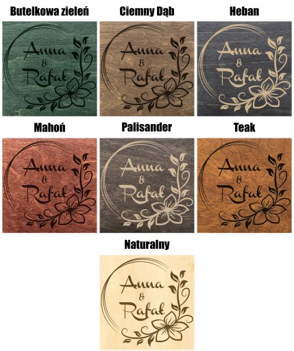 (wybrany kolor dotyczy jednocześnie drewna oraz graweru - zgodnie z poniższymi zdjęciami)