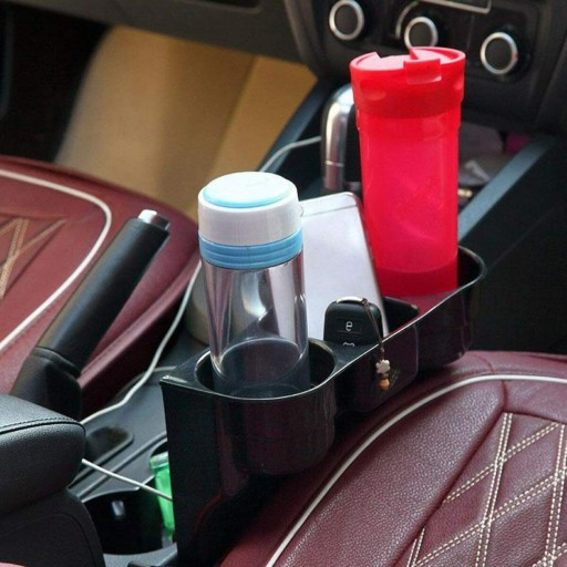 Uniwersalny uchwyt samochodowy na napoje butelki, puszki z napojami, kubki oraz drobne przedmioty klucze, portfel, telefon itp. W uchwycie znajduje się 5 otworów o różnej wielkości. Dwa okrągłe po bokach na kubki, butelki. Środkowy prostokątny otwór na telefon, klucze, portfel oraz 2 małe otwory np. na długopis. Dzięki temu zawsze będziesz miał pod ręką potrzebne akcesoria i unikniesz bałaganu w aucie.