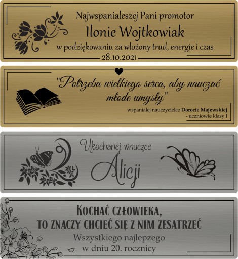 DO ZESTAWU DOŁĄCZANA JEST TABLICZKA SREBRNA LUB ZŁOTA DOKLEJONA DO PUDEŁKA (PATRZ ZDJĘCIE GŁÓWNE), NA KTÓREJ WYGRAWERUJEMY DOWOLNĄ TREŚĆ - MOŻESZ RÓWNIEŻ ZAINSPIROWAĆ SIĘ I UŻYĆ NASZYCH WZORÓW, Z UŻYCIEM WŁASNYCH DANYCH