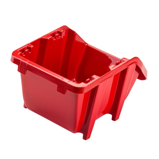 Ergonomiczny kształt pojemników umożliwia ich piętrowanie. Zastosowany stelaż umożliwia również układanie ich w stos, dzięki czemu możemy znacznie zaoszczędzić przestrzeń przy stanowisku, usprawnić dostęp do drobnych elementów. Przemyślana konstrukcja pozwala na wkładanie pojemników jeden w drugi. Otwarty front zapewnia łatwy dostęp do zawartości pojemnika. Pojemniki można wieszać na tablicach narzędziowych dostępnych w naszej ofercie.