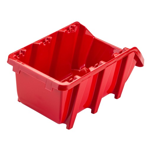 Ergonomiczny kształt pojemników umożliwia ich piętrowanie. Zastosowany stelaż umożliwia również układanie ich w stos, dzięki czemu możemy znacznie zaoszczędzić przestrzeń przy stanowisku, usprawnić dostęp do drobnych elementów. Przemyślana konstrukcja pozwala na wkładanie pojemników jeden w drugi. Otwarty front zapewnia łatwy dostęp do zawartości pojemnika. Pojemniki można wieszać na tablicach narzędziowych dostępnych w naszej ofercie.