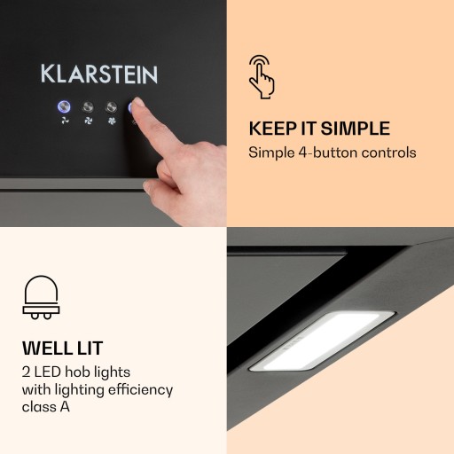 Okap kuchenny marki Klarstein łączy styl i funkcjonalność: wyciąg kuchenny o natężeniu przepływu powietrza do 596 m³/h zapewnia czyste powietrze w kuchni. Dwa wbudowane panele LED oświetlają płytę kuchenną tak jasno jak w dzień. Wszystkimi funkcjami można wygodnie sterować za pomocą 4-przyciskowego panelu sterowania. Wysokiej jakości materiały i kubiczna stylistyka łączą się, tworząc prawdziwy element przyciągający wzrok. Trzy poziomy mocy, niski poziom hałasu podczas pracy wynoszący 69 dB i klasa efektywności energetycznej A sprawiają, że Kronleuchter marki Klarstein przekonuje do siebie na całej linii.
