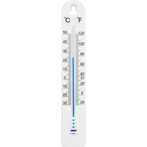 Solidny, termometr uniwersalny wykonany z białego tworzywa, sprawdzi się zarówno jako termometr zewnętrzny ( jeśli min temperatura nie przekracza -20°F lub -30°C), jak i termometr używany w środku pomieszczeń. Dzięki uchwytowi znajdującemu się u góry termometru, bez problemu przywiesisz go w dowolnie wybranym miejscu! Termometr pozwala na kontrolowanie temperatury w zakresie od -30°C do +50°C z tolerancją błędu +/- 1°C i nie zawiera rtęci. Nie musisz się więc obawiać, że przy stłuczeniu z termometru wydobędzie się szkodliwa substancja! Termometr posiada kapilarę głęboko osadzoną w zagłębieniu obudowy wykonanej z tworzywa sztucznego, dzięki czemu może on być stosowany także w pomieszczeniach o bardzo dużej wilgotności. Ze względu na minimalistyczny design (prostokąt zakończony z jednej strony wyraźnym łukiem), biały kolor i prostą skalę (odczytu temperatury można dokonać zarówno w stopniach Celsjusza (lewa skala), jak i stopniach Fahrenheita (prawa skala)), urządzenie to świetnie sprawdzi się w każdym otoczeniu!