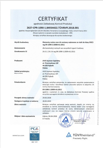 Firma AVIS podnosząc jakość oferowanych produktów przeszła pozytywnie procedurę certyfikacji w ramach normy PN-EN 1090, która wyznacza standardy w obszarze produkcji m.in. konstrukcji stalowych. Certyfikację w tym zakresie przeprowadził lider na rynku usług certyfikacyjnych i badawczych w Polsce – firma TÜV Rheinland.