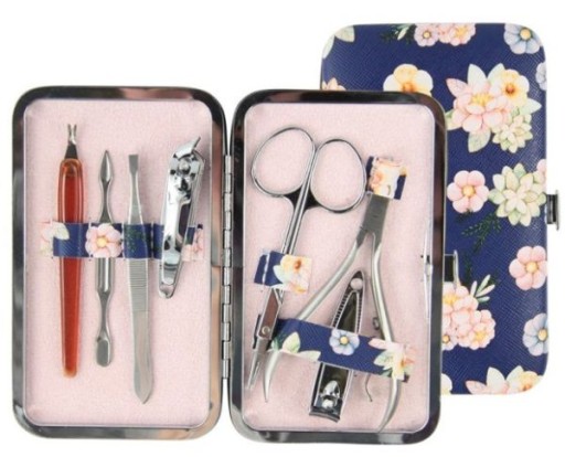 W skład zestawu wchodzi: radełko, kopytko, nożyczki, cążki do skórek, skośna pęseta oraz dwa obcinacze do paznokci - prosty i skośny.