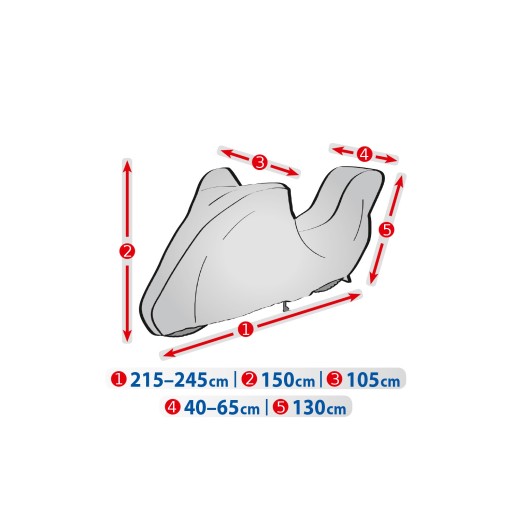 - pokrowiec jest nieprzemakalny, dzięki czemu motocykl pod pokrowcem jest zabezpieczony przed deszczem lub śniegiem, a gromadząca się pod pokrowcem wilgoć jest odprowadzona na zewnątrz