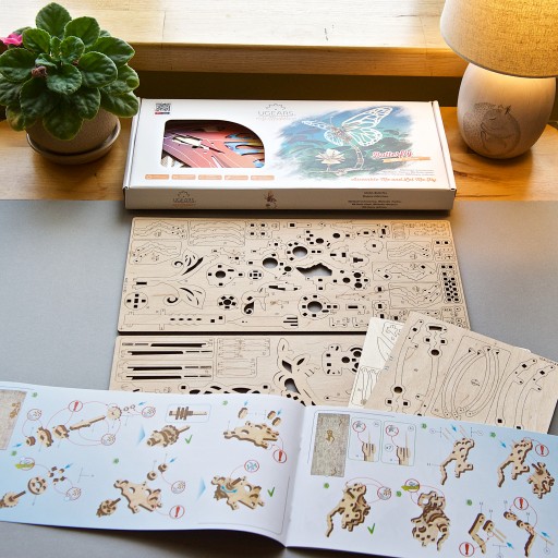 Podobnie jak wszystkie modele Ugears, podczas montażu Motyla nie używa się kleju, dodatkowych narzędzi ani sprzętu. Model jest składany z gotowych elementów wyciętych metodą laserową ze sklejki wykonanej z naturalnych materiałów drzewnych. Po naciśnięciu gotowe do montażu części można łatwo wyjąć z płyty.