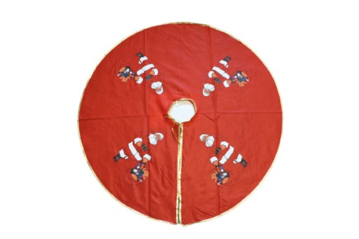 Pokrowiec okrągły pod choinkę wykonany z solidnego materiału, posiada wszytą tasiemkę do wiązania i zaciskania. Idealny do zamaskowania stojaka pod choinkę. Ze świątecznym motywem Mikołaja z choinką.