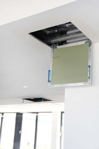 - Wykonana z profili aluminiowych z wypełnieniem wodoodporną płytą kartonowo gipsową o grubości 12,5 mm nadającą się do wilgotnych pomieszczeń.