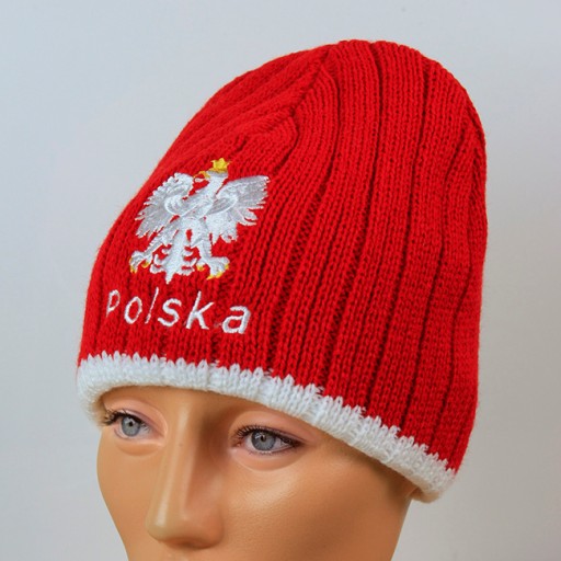 Czapka kibica zimowa z orłem stylizowanym na godło Polski, napisem Polska i barwami stylizowanymi na flagę Polski, kolor czerwony. Akryl 100%