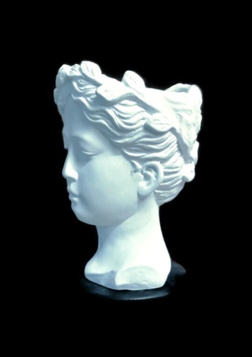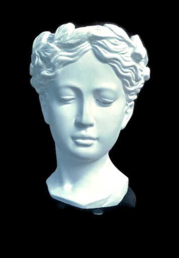 Doniczka-osłonka.Antyczna głowa kobiety.Pojemnik na bibeloty.Wysokość 21cm.Szerokość 15cm.Otwór na doniczkę 10cm.Materiał:konglomerat kamienno-cementowy.Kolor biały matowy.