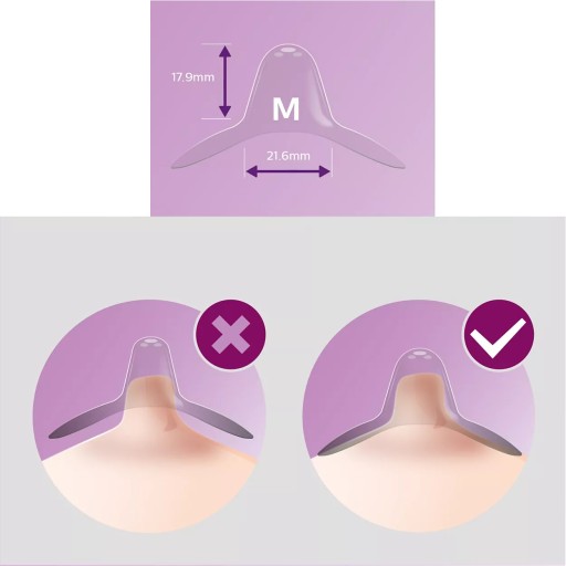 Osłonki brodawek sutkowych są dostępne w dwóch rozmiarach. Małe osłonki pasują do brodawek o średnicy od 12 mm, a średnie — do 21 mm. Aby znaleźć swój rozmiar, usiądź wygodnie i załóż jedną z osłonek na brodawkę. Obróć osłonkę w prawo i wprowadź sutek do tunelu. Następnie rozciągnij podstawę osłonki wokół otoczki brodawki. Jeśli pomiędzy brodawką a silikonem została 2-milimetrowa przerwa, osłonka jest odpowiednio dopasowana. Wskazówka: rozmiar dotyczy brodawki sutkowej, a nie otoczki. Nie wiesz, który rozmiar wybrać? Skontaktuj się z lekarzem, aby uzyskać pomoc.