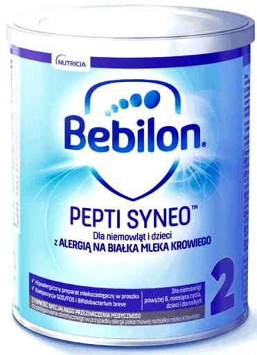 Dla niemowląt od 6. miesiąca życia, które nie mogą być karmione piersią, do postępowania dietetycznego w przypadku alergii pokarmowej na białka mleka krowiego. Bebilon Pepti Syneo 2 zawiera białka serwatkowe poddane hydrolizie znacznego stopnia, co znacznie obniża ich alergenność. Zawiera także komplet składników odżywczych niezbędnych do prawidłowego wzrostu i rozwoju niemowlęcia w drugim półroczu życia, jako podstawa zbilansowanej diety.