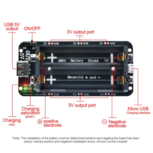 Napięcie wyjściowe 5V prąd znamionowy wynosi 2,2A, maksymalny prąd podtrzymania 3A (nie zalecany do przeciążenia, łatwo uszkodzić moduł, przyspieszyć żywotność), prąd wyjściowy zależy od jakości baterii 18650!