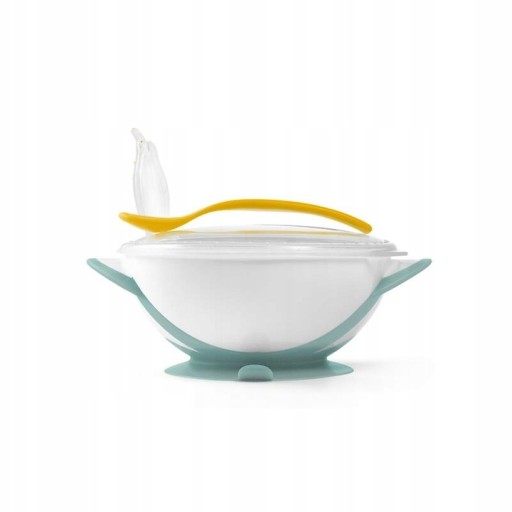 Miseczka z przyssawką i łyżeczką to produkt przydatny na spacerze lub w podróży. Miękka przykrywka szczelnie chroniąca pokarm została wyposażona w system ułatwiający przechowywanie, dzięki któremu łyżeczka nie zabrudzi się, ani nie zgubi. Gumowa przyssawka uniemożliwia przesuwanie się miseczki po stole. Wykonana z bezpiecznych materiałów przeznaczonych do kontaktu z żywnością, produkt jest całkowicie wolny od Bisfenolu A. Można ją stosować w mikrofalówce, a także myć w zmywarce.