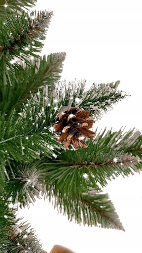 Choinka składa się ze stojaka oraz igliwia. Gałązki zakończone są stożkowo, pokryte szronem oraz kryształkami, które w połączniu ze świątecznymi lampkami będą pięknie połyskiwać. Choinka wygląda bardzo naturalnie poprzez wykorzystanie do jej produkcji najwyższej jakości tworzyw oraz równomiernie rozmieszczonym szyszką, które są na stałe przymocowane do gałązek.
