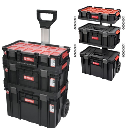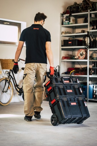 Modularny, 3-częściowy, mobilny system skrzyń, pozwalający dostosować sposób transportu narzędzi i akcesoriów do bieżących potrzeb. Mobilny wózek, skrzynka na narzędzia i organizer na drobne akcesoria, połączone są bezpiecznymi, łatwymi w użyciu łącznikami.