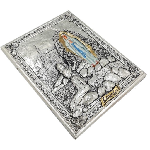 Ręcznie wykonana ikona przedstawiająca wizerunek Matki Bożej z Lourdes. Postać Matki Bożej namalowana została ręcznie, a wokół niej umieszczona została metalowa oprawa, która pokryta została warstwą srebra oraz złota (złote elementy).