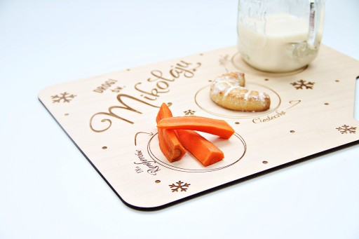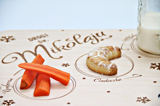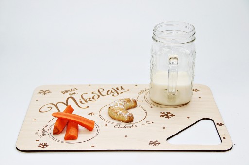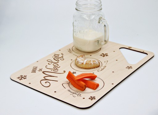 Nasza propozycja to drewniana tacka dla Mikołaja, na której dziecko może przygotować poczęstunek w podziękowaniu za prezenty, oraz aby Mikołaj miał siłę do dalszej podróży.
