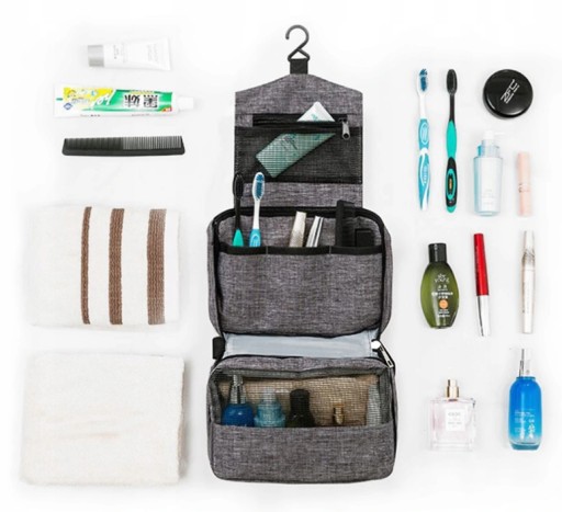 ✅ Wyjątkowo poręczna i jednocześnie pojemna kosmetyczka w kolorze szarym, którą można zawiesić jak wygodny organizer. Idealne rozwiązanie zarówno dla kobiet jak i mężczyzn, którzy chcą komfortowo zadbać o siebie w podróży. Doskonale utrzymuje porządek wśród kosmetyków, a po rozłożeniu sprawia, że każdy kosmetyk jest "pod ręką"!