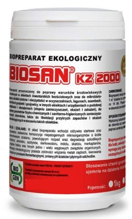 Preparat BIOSAN KZ 2000 przeznaczony do poprawy warunków środowiskowych i sanitarnych w obiektach inwentarskich bezściółkowych oraz do mikrobiologicznej obróbki ścieków i nieczystości w oczyszczalniach, lagunach, szambach, zbiornikach gnojówki i gnojowicy, w innych obiektach i urządzeniach o podobnej uciążliwości i obciążeniach (stopniu zanieczyszczeń, skażeń i zakażeń), do poprawy parametrów fizyko-chemicznych i sanitarno-higienicznych zanieczyszczonych zbiorników oraz ujęć wodnych (jezior, stawów, rzek), a także do likwidacji przykrych zapachów i skażeń mikrobiologicznych w otoczeniu takich obiektów.