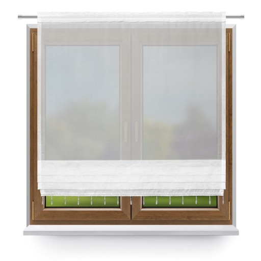 Panel okienny dekoracyjny wykonany z półprzezroczystego woalu. U góry został wszyty tunel, umożliwiający łatwy montaż bezpośrednio na karniszu rurkowym bądź na żabkach. U dołu znajduja się mieniace się koraliki.