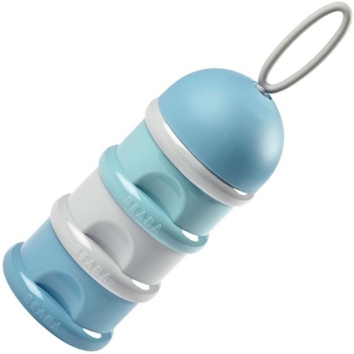 Kompaktowy zestaw 3 pojemników do przechowywania mleka w proszku francuskiej marki BEABA. Pojemniki (pastelowo zielony, jasnoszary i niebieski) mają pojemność w sumie 270 ml (3x90ml).