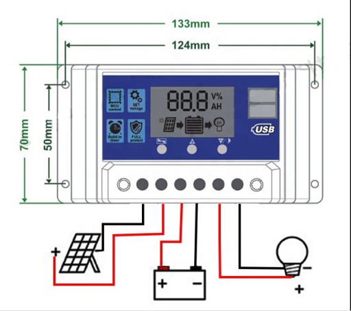 Na wyświetlaczu regulatora można obserwować bieżące napięcie ładowania akumulatorów oraz ustawić/wybrać tryb pracy z akumulatorami żelowymi, kwasowymi i AGM. Dozwolone jest również ręczne zaprogramowanie nastawy napięć i czasu załączania wyjścia.