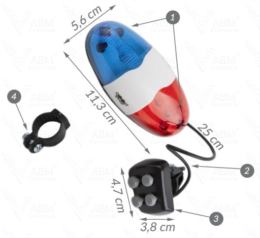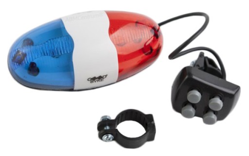 - Zestaw zawiera korpus (z obejmą do kierownicy) dzwonka z półprzezroczystym kloszem niebiesko-czerwonym z osadzonymi 6x światełkami LED po 3 na kolor. Do korpusu poprzez kabelek podłączone jest sterowanie z 4 przyciskami. Każdy przycisk uruchamia inny rodzaj dźwięku i mrugania oświetlenia.