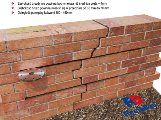 ❖ Odległość od pęknięcia dla muru ceglanego to minimum 500mm od pęknięcia