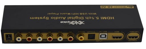 Najnowszy dekoder dźwięku XOLORSpace ® ekstraktuje dźwięk audio ze złącza HDMI. Dźwięk jest dekodowany z formatu cyfrowego i przesyłany równocześnie do złącz analogowych 6xRCA. Dodatkowo posiada wejście SPDIF Toslink oraz wejście SPDIF Coaxialne. Również posiada pełną obsługę ARC. Doskonały dźwięk przestrzenny dzięki przetwornikowi 24 bit z 192kHz. Dźwięk przekazywany na głośniki analogowe może być 2.0 (FL / FR) lub 5.1 (FL / FR, SR / SL, center, subwoofer). Dodatkowa zintegrowana kontrola EDID pozwala na ustawienie formatu wyjściowego na 2.0 lub 5.1. Pełna obsługa rozdzielczości 4Kx2K, CEC oraz 3D pozwala na uzyskanie idealnego obrazu i najwyższą jakość dźwięku. Dodatkowo urządzenie posiada wejście USB-PC do którego można podłączyć komputer lub laptop, dzięki temu dźwięk z laptopa może być przekazywny do głoścników. Drugie złącze USB pozwala na podłączenie pamięci masowej USB. Pilot IR pozwala na regulację głośności oraz wybór źródła dźwięku. Dodatkowo urządzenie posiada Bluetooth.