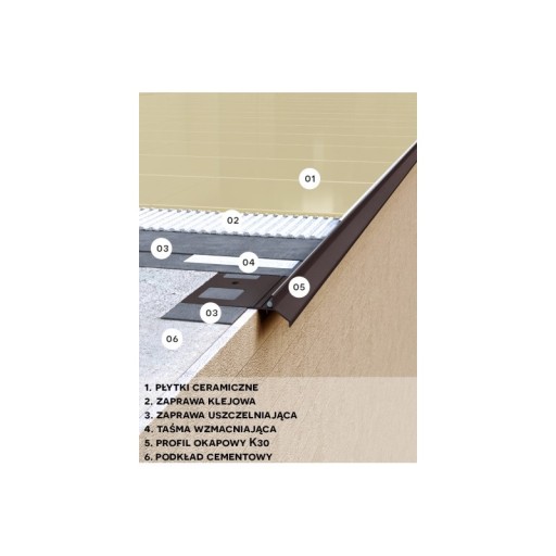 Profil K30 jest jednym z najbardziej funkcjonalnych profili używanych do estetycznego i trwałego wykończenia krawędzi balkonów oraz tarasów gdzie zastosowane zostały płytki układane za zaprawie klejowej (tradycyjne).