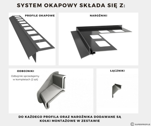 Łączniki używamy do zabezpieczenia, oraz estetycznego zamaskowania przerw dylatacyjnych, które stosujemy przy montażu systemów okapowych. Przerwy dylatacyjne powstają przy łączeniu ze sobą narożników z profilami, oraz profili z profilami.